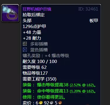 ②狂野机械护目镜:看名字就知道是狂暴战用的,非常的有野性。不仅提供了暴击属性,还提供了命中,要知道近战前期装备还是挺差命中的。装备的物品等级高达127,比t4套物品等级高出了7点。