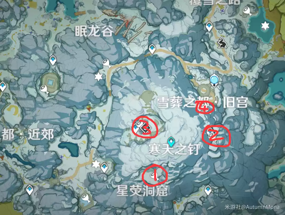 3号点可能会看不清,标识一下(在圣遗物副本门口)。1号点建议从寒天之钉山顶飞下来(如果地图还未走完,建议做主线的时候带一个口袋锚点,放在山顶,方便在雪山的探险)。2号点可以从风神像直接到,前提是你已经收集齐三个宝匣,才能打开大门(这里面也有宝箱)。4号点即在最终宝物门口,在风神像的下一层,这个石碑最后点亮。石碑全部点亮开启大门的机关才会解除封印。这里记得最后的洞窟里有四盏篝火点亮,可以获取新武器。