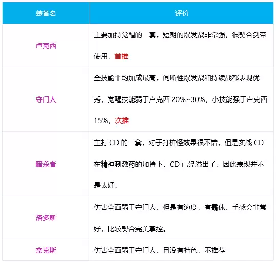 【结论(早期先行版)】:对于剑帝来说,要爆发优先选择阿斯特罗斯,缠斗优选选择贝利亚斯,罗什巴赫作为次要选择。泰马特的负面效果对剑帝非常不友好,容易死亡;雷德梅恩的减CD对剑帝来说并没有那么重要,光剑+精神刺激已经足够了。