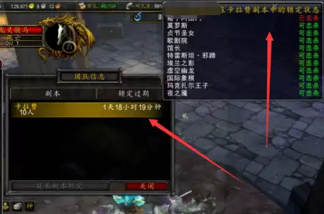 5.在团队对话框的右上角有一个‘团队信息’的红色按钮,点击该‘团队信息’按钮,右侧会弹出当前角色所有有CD的副本信息,这里由于刚才杀了卡拉赞的老一,所有提示卡拉赞锁定时长1天18小时。