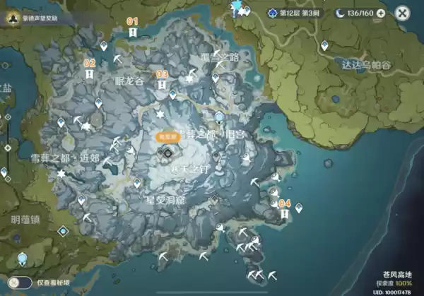 可以根据地图标点来收集所需材料,其中“感叹号”标记的为【奇异的「牙齿」】所在点位,“矿镐”标记的为【星银矿石】所在点位(图中点位收集完大约是61份【星银矿石】)此处有条件的建议队伍中配备「凝光」角色,可以很好地探测出附近【星银矿石】的位置。