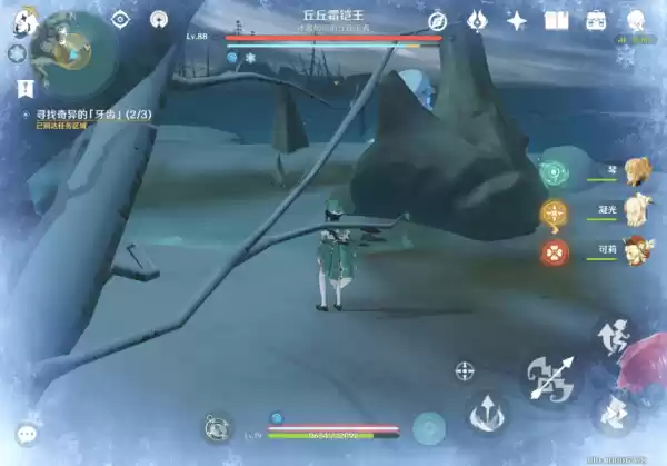 此处【奇异的「牙齿」】被结界四周环绕,由「丘丘霜铠王」看守,击败「丘丘霜铠王」后即可破除结界进去拾取【奇异的「牙齿」】。