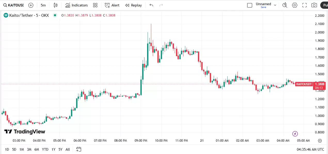 2025 年 2 月 20 日,Kaito Crypto在 OKX、Binance 和 Bithumb 等主要交易所上市,起价为 1 14201 美元,令人印象深刻地进入市场,自首次亮相以来,Kaito 币的价格波动很大,上市当天创下 0 896 美元的历史最低价,并在 2025 年 2 月 21 日创下 1 96 美元的历史最高价