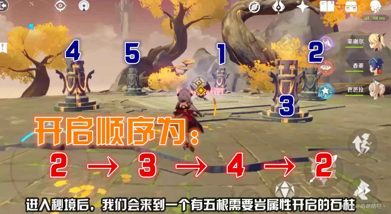 进入秘境后,我们会来到一个有五根需要岩属性开启的石柱,然后顺时针依次点亮全部石柱即可,顺序如下: