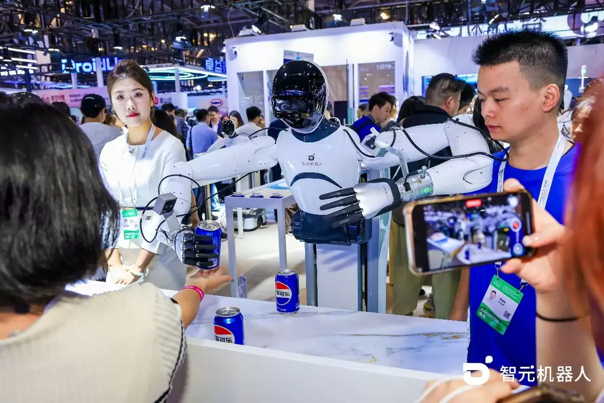 智元机器人展台现场,精灵G1机器人正在给观众递送可乐