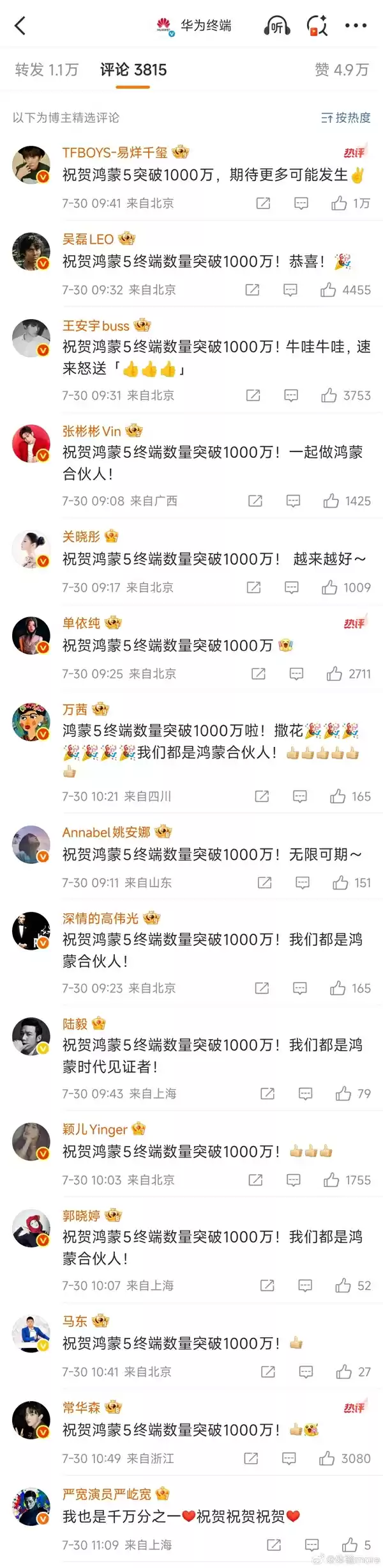 华为宣布鸿蒙5终端数量突破1000万:关晓彤等十几位明星祝贺