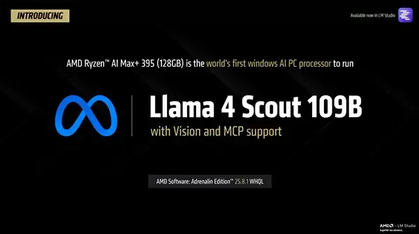 这使得锐龙AI Max+ 395成为第一个能在本地运行1090亿参数的Meta Llama 4 Sout大模型的平台,体积多达66GB,活跃参数最多170亿,并支持Vision、MCP。
