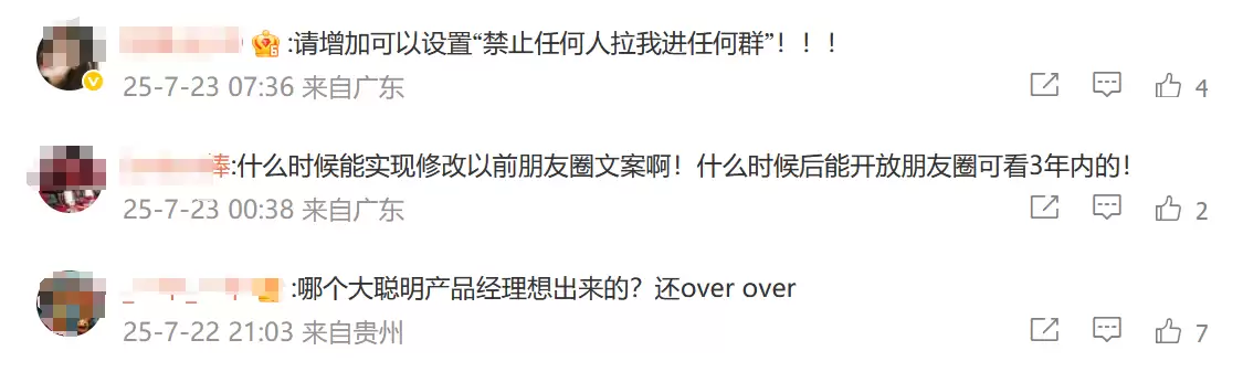 另外,“拒绝被任意拉入群聊”的功能也被一再提起。不少人都有过这样的困扰:莫名其妙就被熟人拉进各种群聊,不仅浪费时间退出,还可能被群内的推广人员频繁添加。许多人建议增设“拉群前需经本人同意”或“选择性入群”的设置选项。此外,诸如聊天中发送实况照片、朋友圈发布长视频、自动收款提示、表情包分类管理等功能的建议也频频出现。