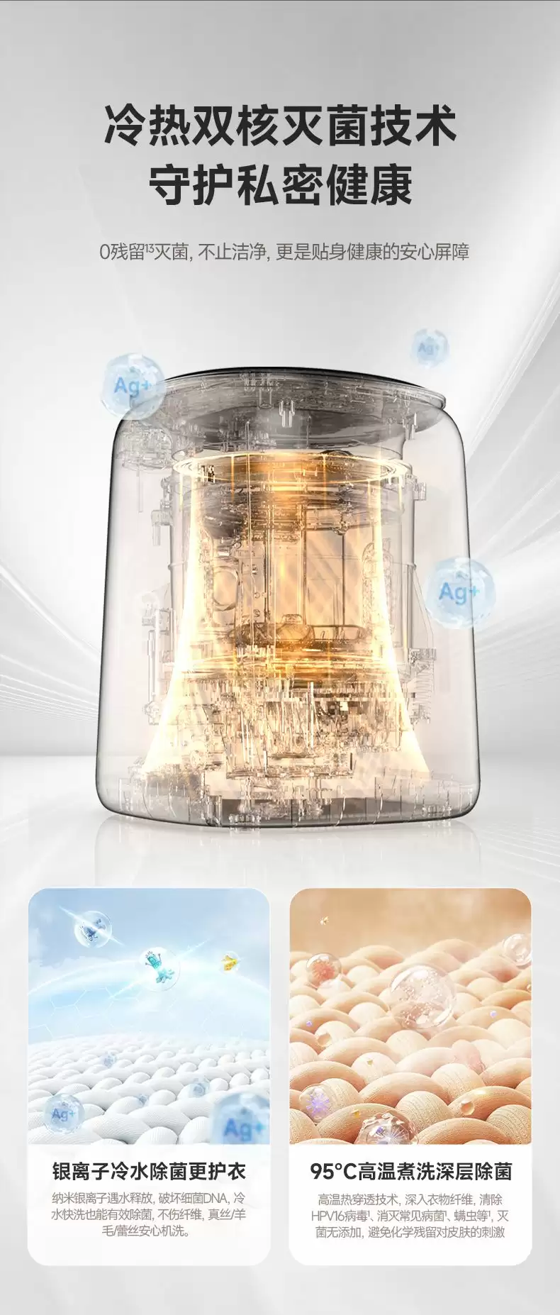 冷热双核灭菌技术是「小觅罐」的核心优势。它创新融合了母婴级双灭菌系统——95℃高温煮洗与纳米银离子冷渗透技术。95℃高温能瞬间气化HPV16等病毒,灭活率高达99.99%;纳米银离子则深入纤维内部,破坏细菌DNA结构。双重强力灭菌保障下,灭菌率超越行业标准,并通过了12项严苛的母婴家电优品认证,为母婴、敏感肌肤人群及宠物家庭构筑起全方位的健康“隐形防护盾”,彻底消除混洗带来的健康焦虑。