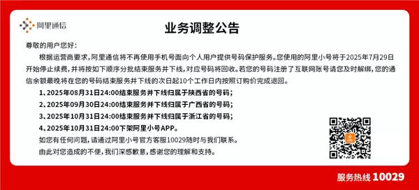 2025年7月29日,阿里通信在其官方网站发布公告称,阿里小号服务将于2025年8月31日起逐步终止运营,即日起暂停所有号码续费服务。