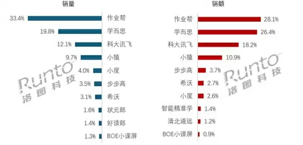 从品牌表现来看,作业帮以33.4%的市场占有率遥遥领先,同时包揽销量与销售额双项冠军,成为本年度学习平板市场的最大亮点。