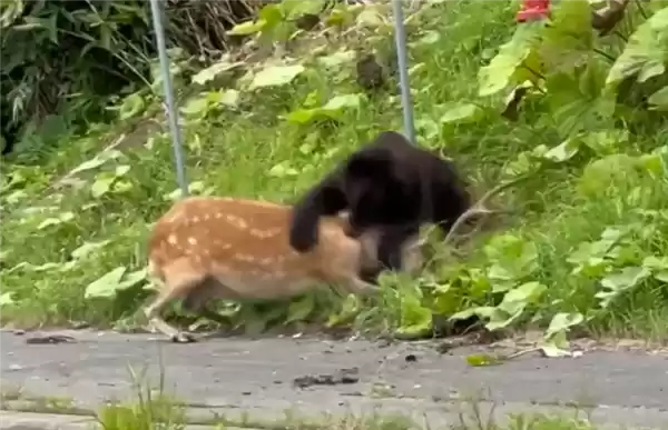 7月28日消息,你可能永远也想不到,好好的道路突然堵车究竟是因为什么。当地时间本月27日,日本北海道一头熊在国道上袭击一只鹿并将其拖入草丛,袭击全程被拍下。只见这只棕熊狠狠地咬住鹿的脖子,虽然鹿极力