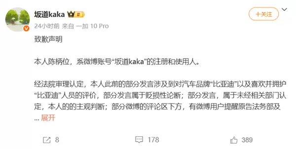 7月29日消息,博主“@ 坂道kaka”日前发布致歉声明,向比亚迪致歉并赔偿。