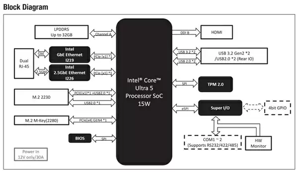 内存配置采用单通道LPDDR5-6400规格,最高支持32GB容量。存储方面配备一个M.2 2280接口,支持PCIe 4.0 x4或SATA通道。网络连接配备Intel I226 2.5G网卡与I219 1G网卡的双网口设计。音频功能则未在配置中体现。