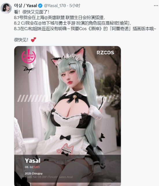 在今年BW名声大噪的韩国人气Coser Yasal发文宣布即将再次在中国参加活动。
