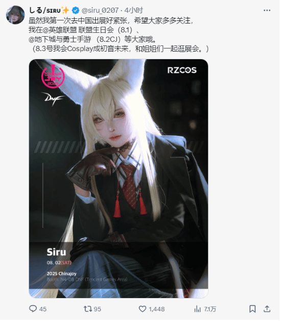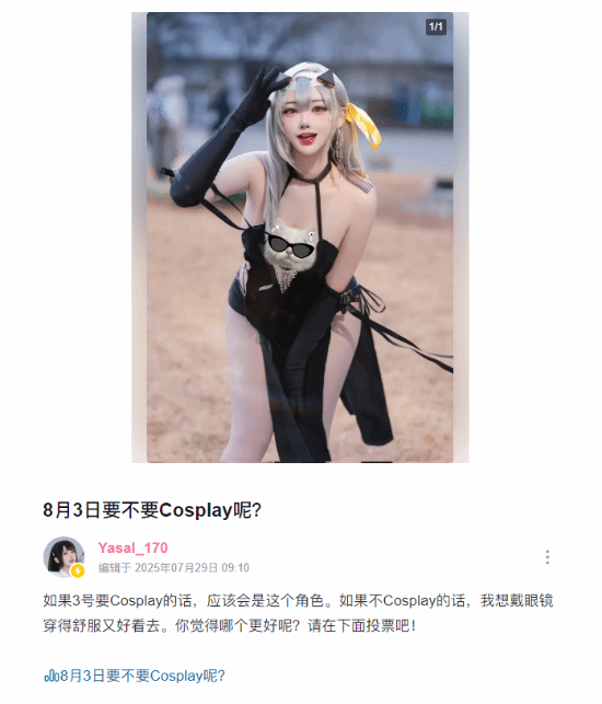 她写道:“很快又见面了!8月1日我会在上英雄联盟 联盟生日会扮演狐狸;8月2日,CJ我会亮相@地下城与勇士手游展区 扮演的角色暂时保密;8月3日在CJ和姐妹逛逛没有明确安排,我要Cos《原神》的「阿蕾奇诺」插画版本哦。我还想戴眼镜、穿得舒服又好看,你觉得哪个更好呢?”