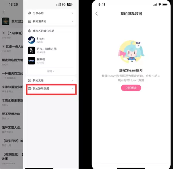 用户加入小站后,在App端进入小站,从任意小站点击右上角侧边栏,选择“我的游戏数据”,即可开启Steam绑定流程。