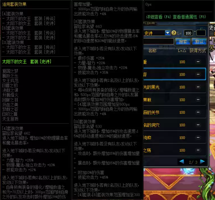如何获取DNF太阳下的女王套装?通关巨龙的秘宝副本可以收集特殊材料和太阳下的女王传说套装,使用这些材料将传说套装升级后,即可获得太阳下的女王史诗套装。这套装备是巨龙的秘宝八大史诗套装中的重要选择。