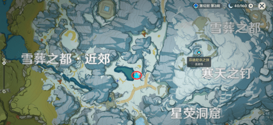 右上角这枚信标在古代坚冰下放,需要拾取深赤之石后融化坚冰,深赤之石及该信标位置如下图。