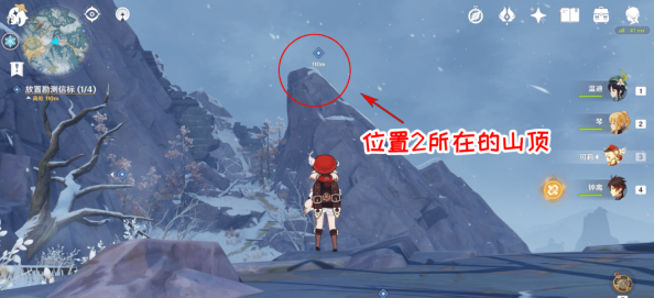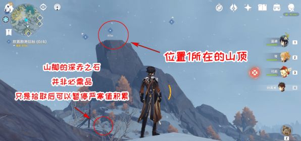 位置1:位于任务指引的蓝色标记处的山顶,需要掌握好攀爬时体力的控制。由于严寒值的存在,在严寒值积满后血量会逐渐扣除,因此也需要注意控制时间,在攀爬前可以拾取山脚下的深赤之石,暂停严寒值的积累,减少难度(并非必需,不拾取也可以)。