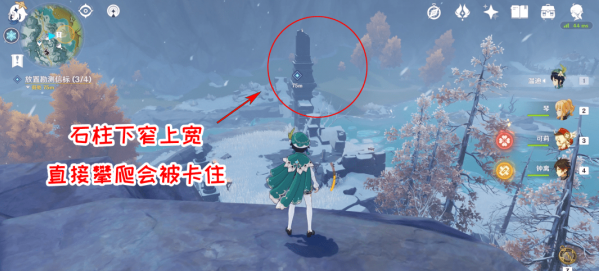 位置4:位于任务指引的蓝色标记处的石柱顶端,由于石柱的下半部分下窄上宽,凸起部分导致在攀爬时会被卡住,不另寻高点往过飞的话,就需要一个垫脚的过程。可以使用捕风瓶制造风场、或使用温迪、刻晴、岩主、钟离等角色的技能来达到规避凸起、攀爬至最高处的需要。
