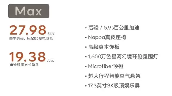 Max版价格贵了1.2万,也是单电机后驱,但多了Nappa真皮座椅、Microfiber顶棚、超大行程智能空气悬架、·17.3英寸3K吸顶娱乐!