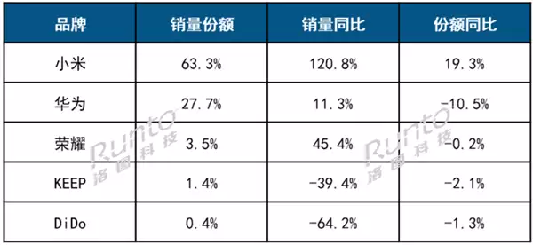 而KEEP和DiDo分别以1.4%和0.4%的份额位列第四、五位,但销量同比均出现下滑,与小米、华为拉开巨大差距。