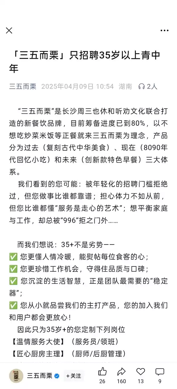 该企业表示,35+不是劣势,更懂人情冷暖,能熨帖每位食客的心;更珍惜工作机会,守得住品质与口碑;35岁员工的加入我们和用户都会更放心。
