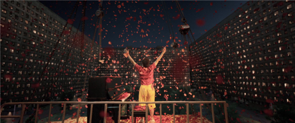 当郎朗被吊桥吊起,在空中弹奏着《浏阳河》和《保卫黄河》,身边的筒子楼里站满了工农人民,郎朗身穿上红下黄,基本上可以理解为一种魔幻超现实主义的升旗仪式。