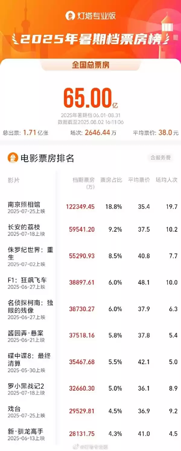 8月2日消息,据灯塔专业版,截至今天16时11分,2025年暑期档(6月-8月)总票房(含预售)突破65亿!
