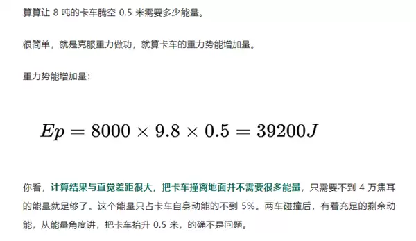 经过精确计算可知:**要让8吨重的卡车腾空0.5米,仅需要约39200焦耳的能量,这还不到卡车总动能的5%。**这意味着剩余动能完全可以实现这一效果。