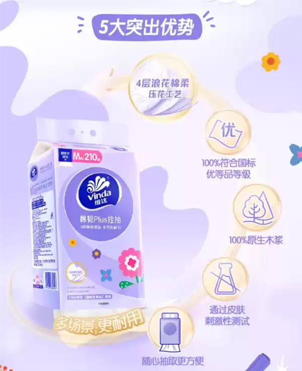 厚度提升20%:维达棉韧悬挂式抽纸29元6提百亿补贴