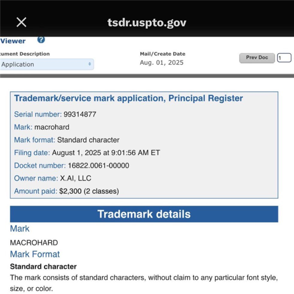 8月3日消息,据报道,马斯克旗下的xAI于8月1日提交了“Macrohard(巨硬)”这一商标的注册申请,且已支付了2300美元(约16587元人民币)的注册费用,涵盖两个商标类别。