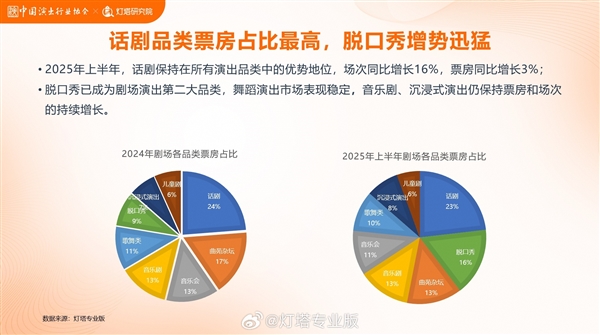 灯塔研究院与中国演出行业协会数据显示,从品类票房占比看,2024年脱口秀仅9%,2025年上半年跃升至16%,仅次于话剧,成为剧场演出第二大品类。