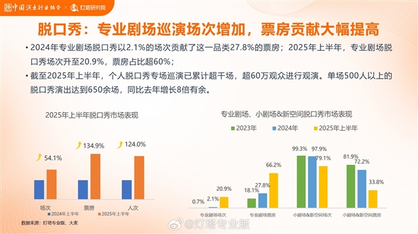 回溯2024年,专业剧场脱口秀仅以2.1%的场次贡献27.8%票房,已显潜力;2025年上半年,场次占比飙升至20.9%,票房占比超60%,实现“场次翻10倍”的飞跃。