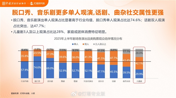 专业剧场巡演场次激增,带动票房同比涨134.9%,单人观演占比74.6%,贴合年轻群体消费习惯,让脱口秀从综艺“衍生”成独立演出品类。