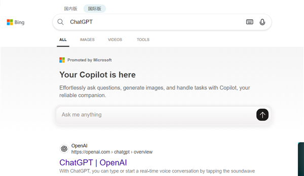 如今,微软似乎将目标转向了AI领域的竞争对手,如果用户在Bing中搜索对手的服务,会看到一个写着“您的Copilot在此”的横幅,暗示用户无需再寻找其他服务。