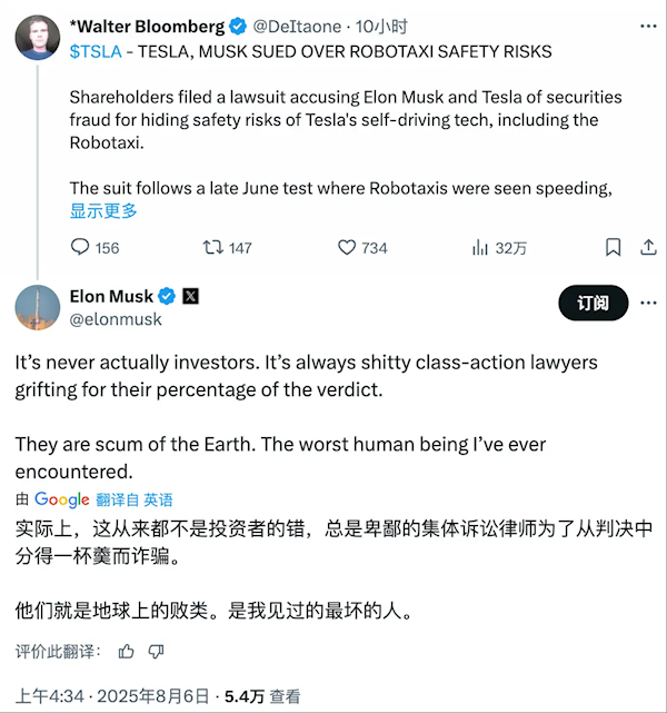 特斯拉因Robotaxi被股东起诉欺诈 马斯克怒斥律师:地球上最坏的人