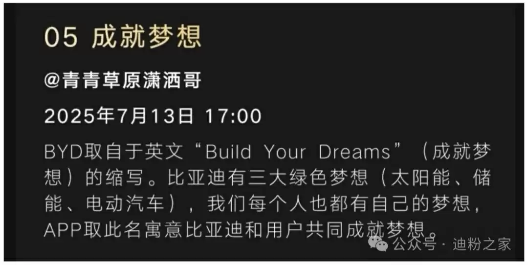 根据投票描述,“成就梦想”取自比亚迪的英文名“Build Your Dreams”。