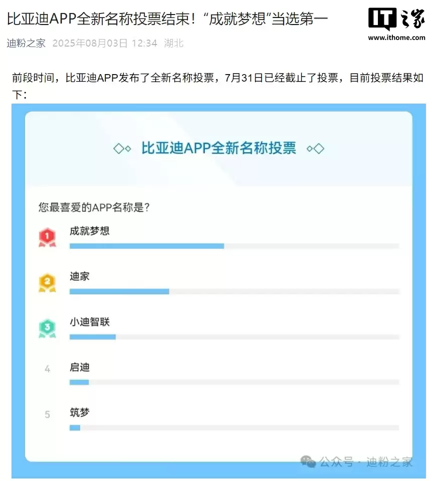 8 月 4 日消息,据“迪粉之家”公众号昨日消息,比亚迪 App 发布的全新名称投票,已经于 7 月 31 日截止,“成就梦想”当选第一。