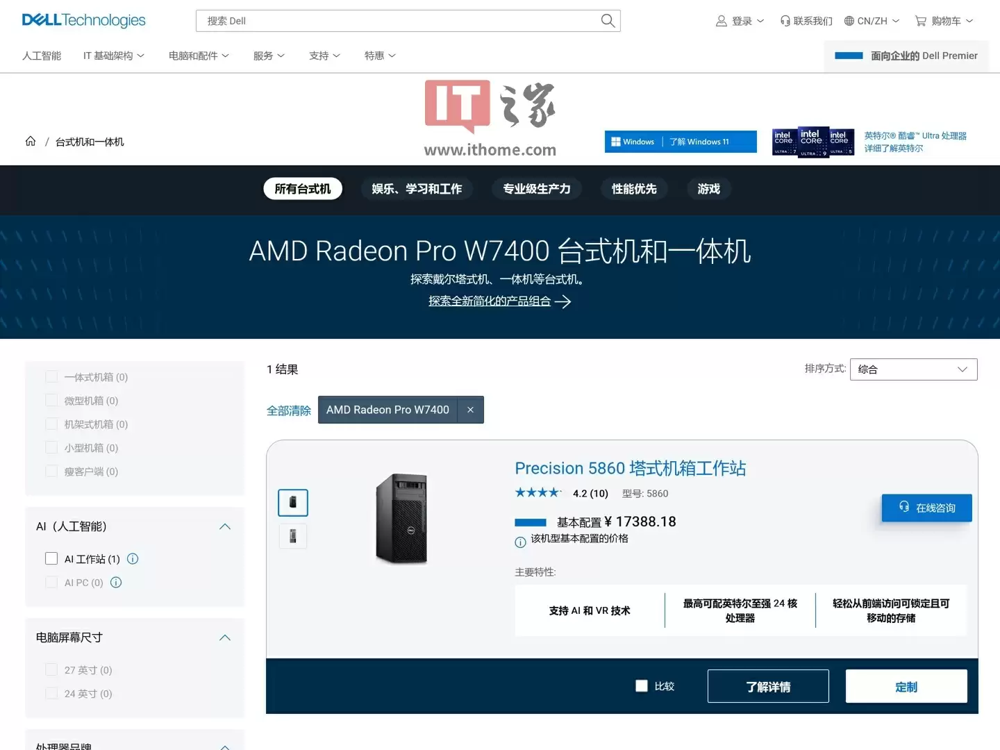 根据的查询,戴尔台式机已可选 Radeon PRO W7400 显卡配置: