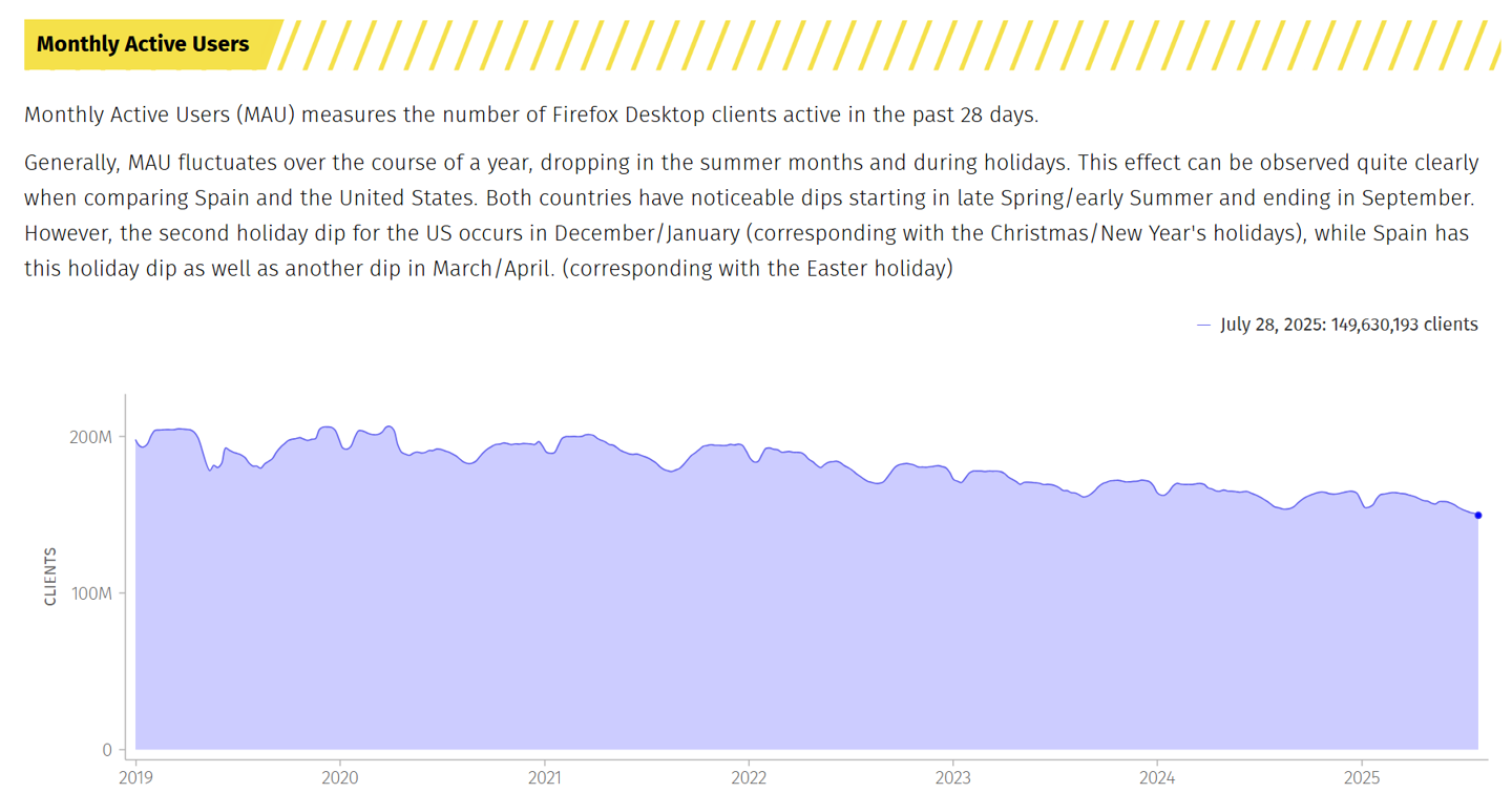 8 月 7 日消息,根据官方统计数据,2025 年第 31 周(7 月 28 日周一开始计算),火狐 Firefox 浏览器的全球周活跃用户数量首次跌破 1.5 亿,活跃用户数据为 149630193。