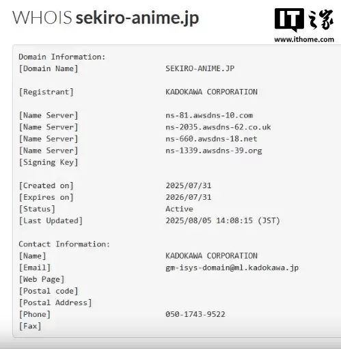 值得注意的是,EuroDNS域名查询平台最新数据显示,关键域名sekiro-anime.jp已于7月31日被角川集团正式注册——这正是游戏开发商FromSoftware的母公司。