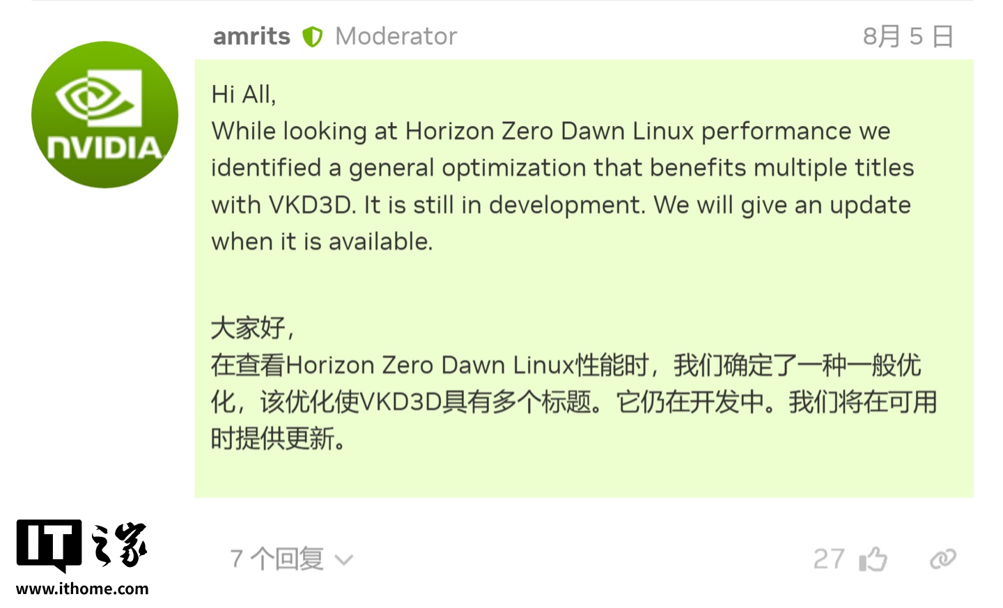 开发者 amrits 指出,Linux 版《地平线:零之曙光》的性能问题源于一个普遍的优化问题,这也影响了使用 VKD3D-Proton 的其它游戏,目前已着手开发修复这个问题,在完成后将会提供更新。