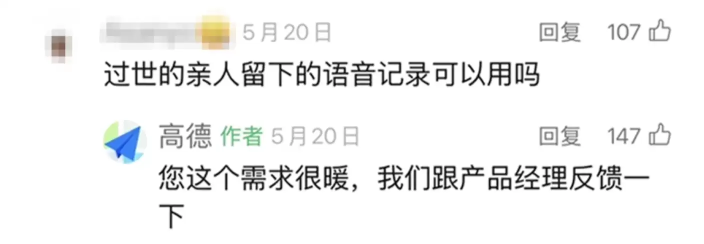 有用户留言称,希望利用过世亲人留下的语音记录制作导航语音包(公众号原留言记录已删除或隐藏,官方视频中分享的截图已为该留言用户昵称打码)。