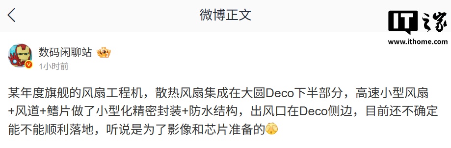 在此援引博主介绍,该工程机的高速小型散热风扇集成在机身后摄 Deco 的下半部分,拥有真正的风道,散热鳍片做了“小型化精密封装”,并拥有防水结构,出风口在 Deco 侧边。