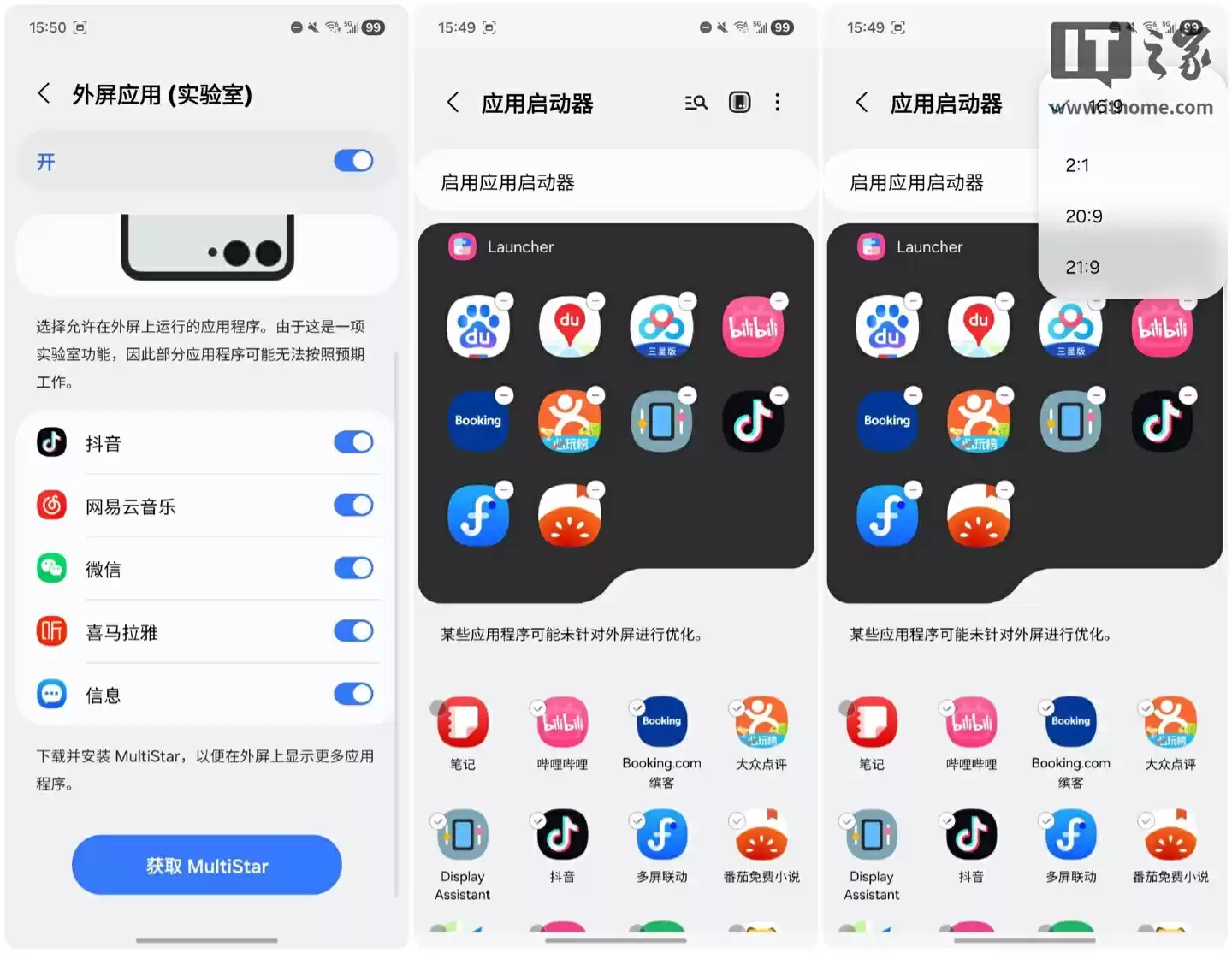 通过设置里的实验室功能,第三方应用也能轻松搬到外屏上 —— 现在抖音、小红书、网易云音乐、微信这些高频使用的 APP,不用开盖就能直接用。若想添加更多应用,下载应用启动器即可,甚至能在设置里调它们在外屏的显示比例,自由度高得有点出乎意料。