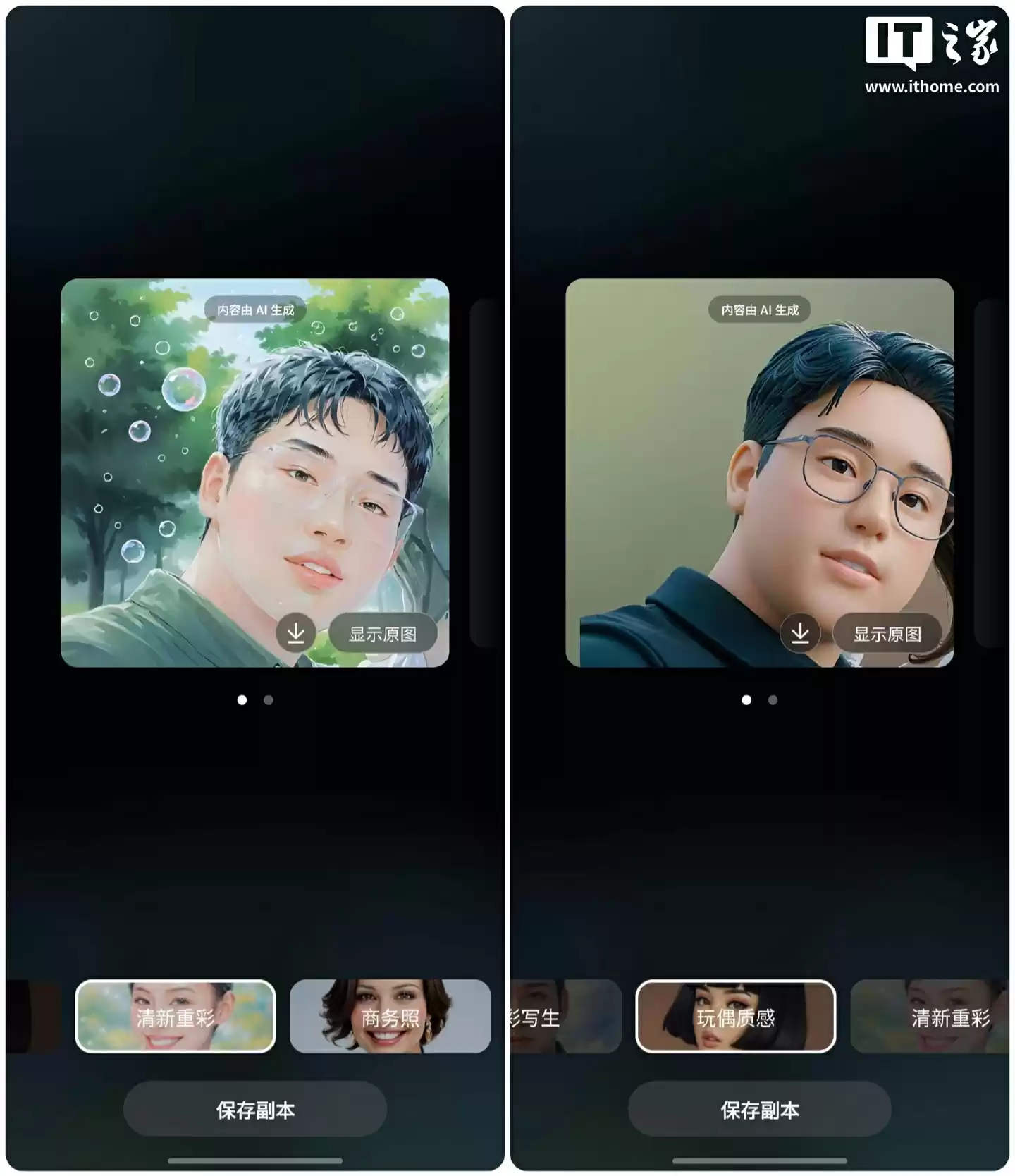 比如“照片助手”,点一下就能自动优化照片的曝光、色彩和构图。“AI 头像”功能可以将普通照片中的头像,变成艺术品,水彩风、卡通风这些热门艺术效果。