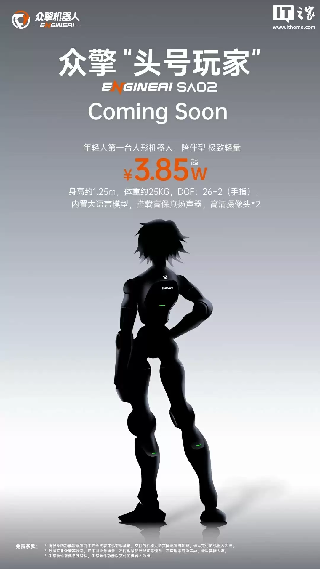 从海报可以看到,该机器人采用细长身材设计(可能有头发),身高约 1.25m,体重约 25kg,拥有 26+2(手指)自由度,内置大语言模型,搭载高保真扬声器,2 个高清摄像头,主打陪伴,售价 3.85 万元起。