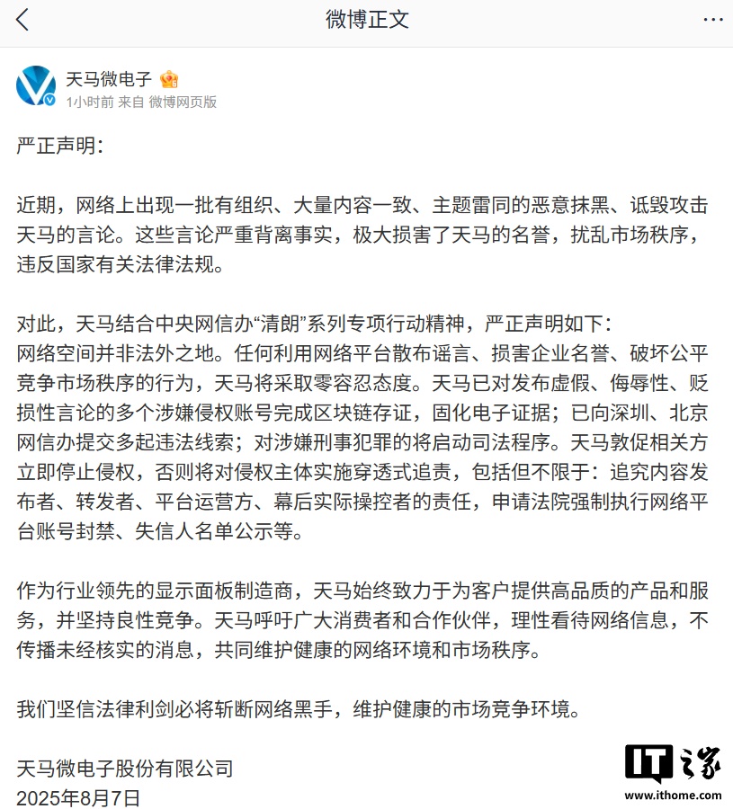 8 月 7 日消息,天马微电子今日发布严正声明,称近期网络上出现一批有组织、大量内容一致、主题雷同的恶意抹黑、诋毁攻击天马的言论。这些言论严重背离事实,极大损害了天马的名誉,扰乱市场秩序,违反国家